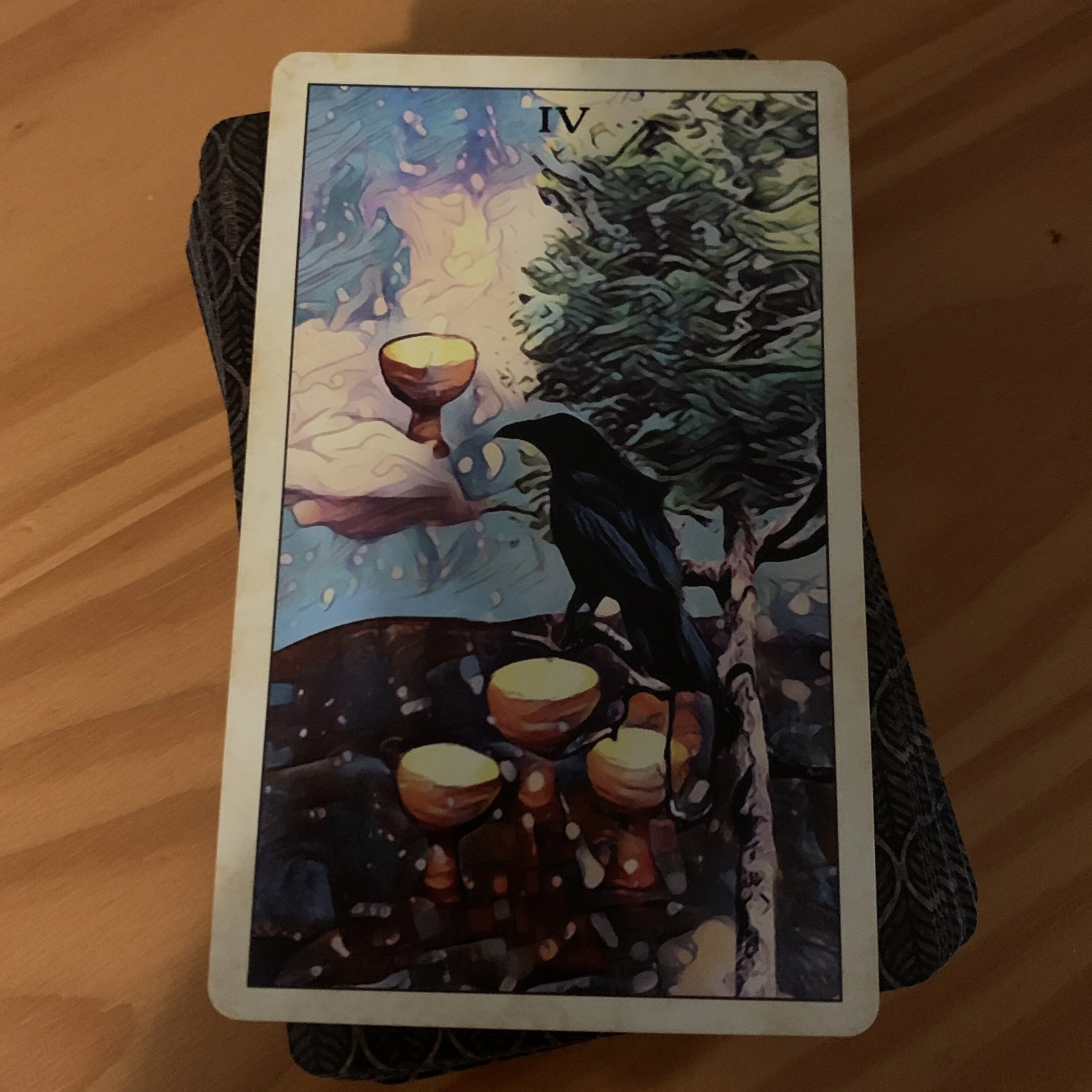 /4 of Cups: What wildness is the cost of your security? What’s missed by roosting on what is, ignoring what is almost or almost possible? There’s an offering in the offing, just at the edge of your field of feeling. Who convinced you that what you have is all there is? That nothing greater waits for you? That the price of anything else is the cost of it all? Lies meant to keep you small. Look up. The sky’s about to bloom, even if first it falls.