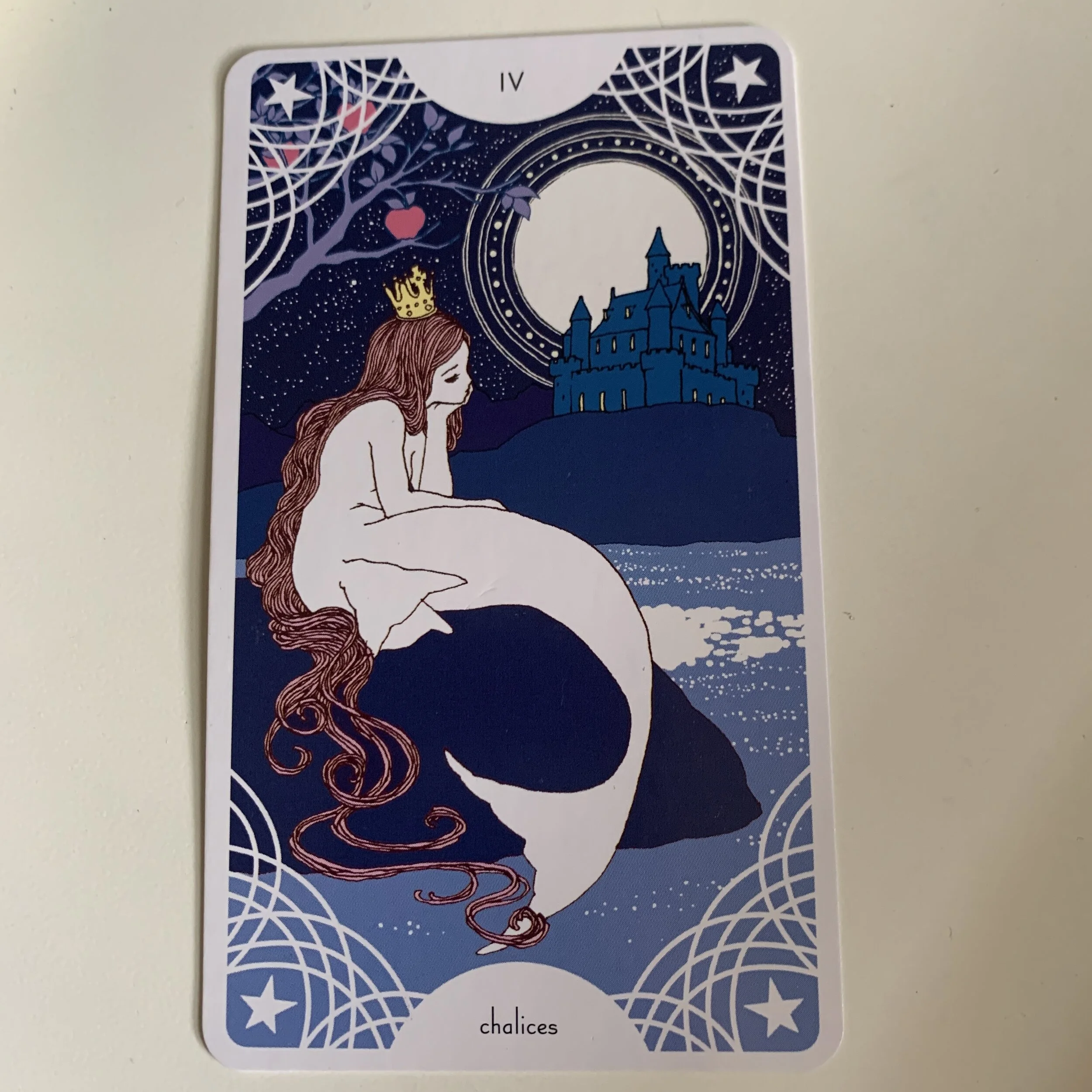 /Four of Cups: That story about Newton realizing gravity existed when an apple fell on his head is probably a myth, but it could be true. The answer to what’s stirring in your sentient guts is in the apple above your head, or in the stars just past that, or in the star in the apple or the seed in the star. Look up. What’s above you that you hardly ever notice? What happens when you tip your head back and the throat naturally opens? It’s a posture of vulnerability to offer the neck like that, the other side of the gesture of a head bowed or bent. Dissatisfaction is a contracted position, the shoulders drawn forward and down. What happens when you just for a moment expand? What light starts to flicker or get in?